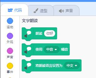 首先在扩展功能中添加文字朗读,文字朗读代码指令分组一共有三个指令,如下: