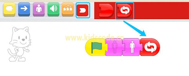 第三步:点击橙色类的块来显示控制块,拖动重复块到脚本区域,并把它放置在两个紫色的外观块上。