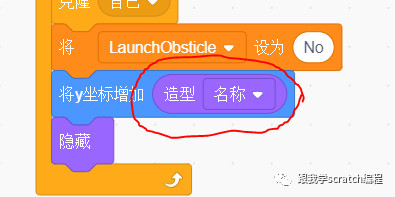 那如何做到呢?我们分析代码,会发现这里面有一个状态变量:LaunchObstacle。这个变量就是一个开关变量,来决定什么时候开始一个克隆。在主程序的循环里面有一个等待命令。这有等待到这个变量的值是YES的时候才会克隆下一个变量。而在克隆启动的子程序里面,我们会看到有一段语句: