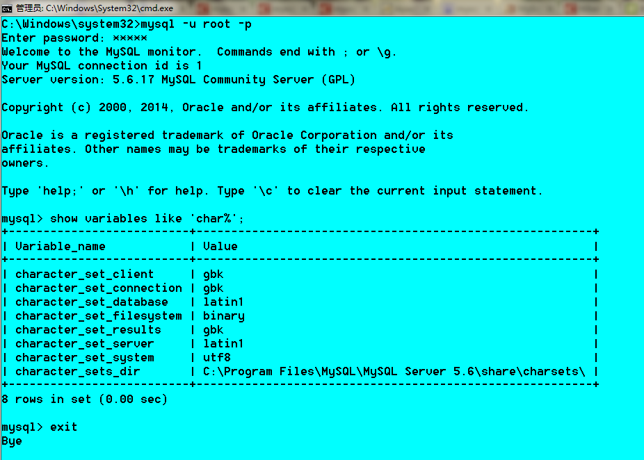 1)输入 mysql -u root -p 进入mysql数据库 2)键入密码:*****(自己的密码,没有的话直接回车键,嗯其他情况如忘了root密码百度去orz。。) 3)show variables like 'char%'; 显示编码格式下图一为未修改my.ini配置文件的编码文件latin1(即ISO-8859-1),图二为已经修改过的。ouv少儿编程网-Scratch_Python_教程_免费儿童编程学习平台